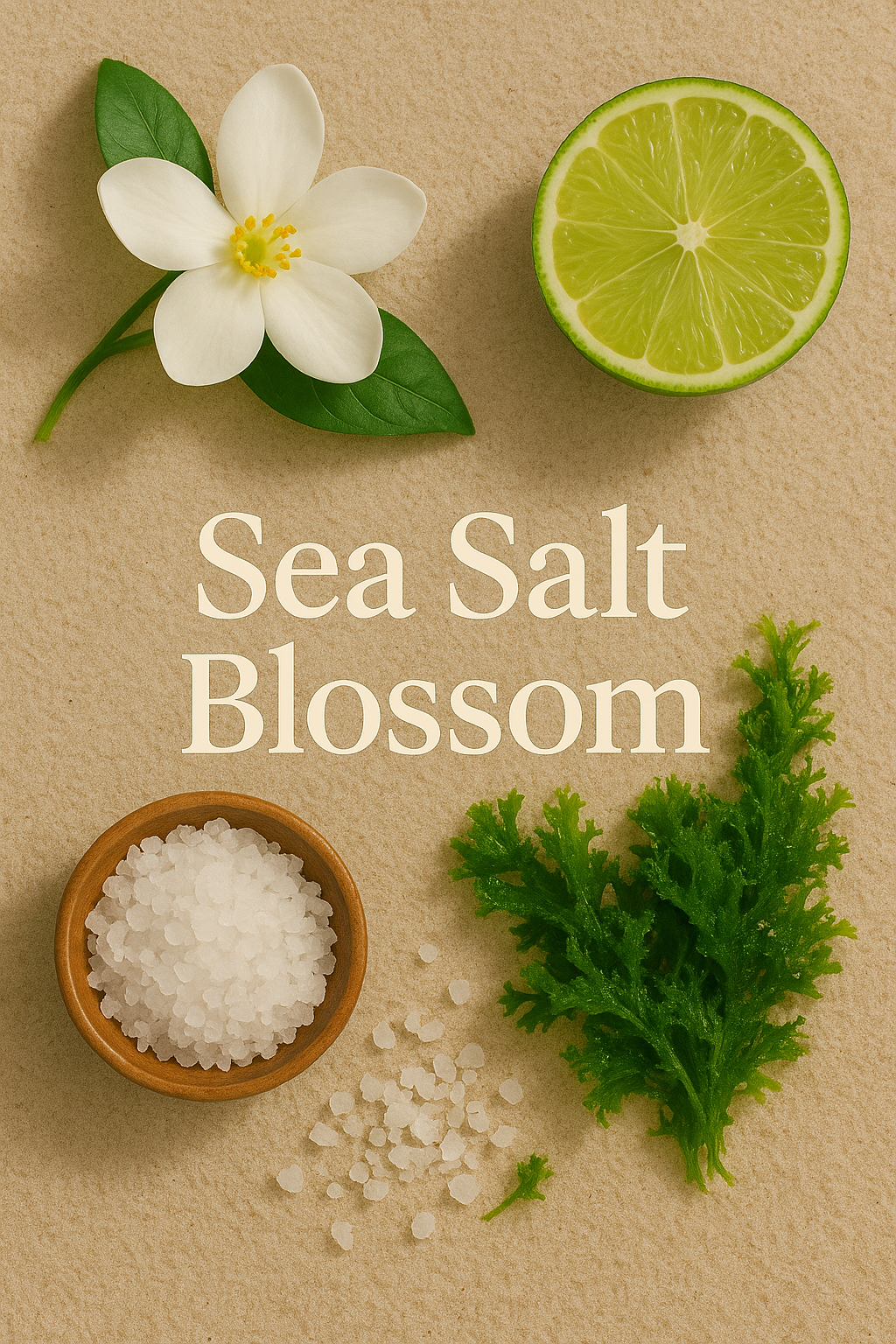 Crisp and airy — Sea Salt Blossom drifts with aquatic florals, bright bergamot, and fresh sea moss for a clean, uplifting scent.