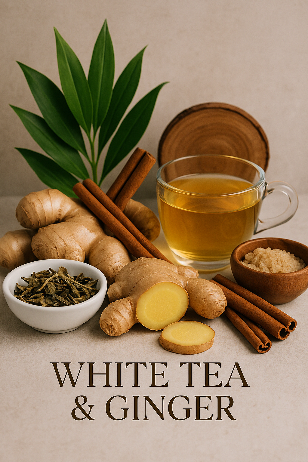 Clean, calming, and lightly spiced — White Tea & Ginger blends soft tea leaves with warm ginger and a touch of sandalwood for an elegant, balanced scent.